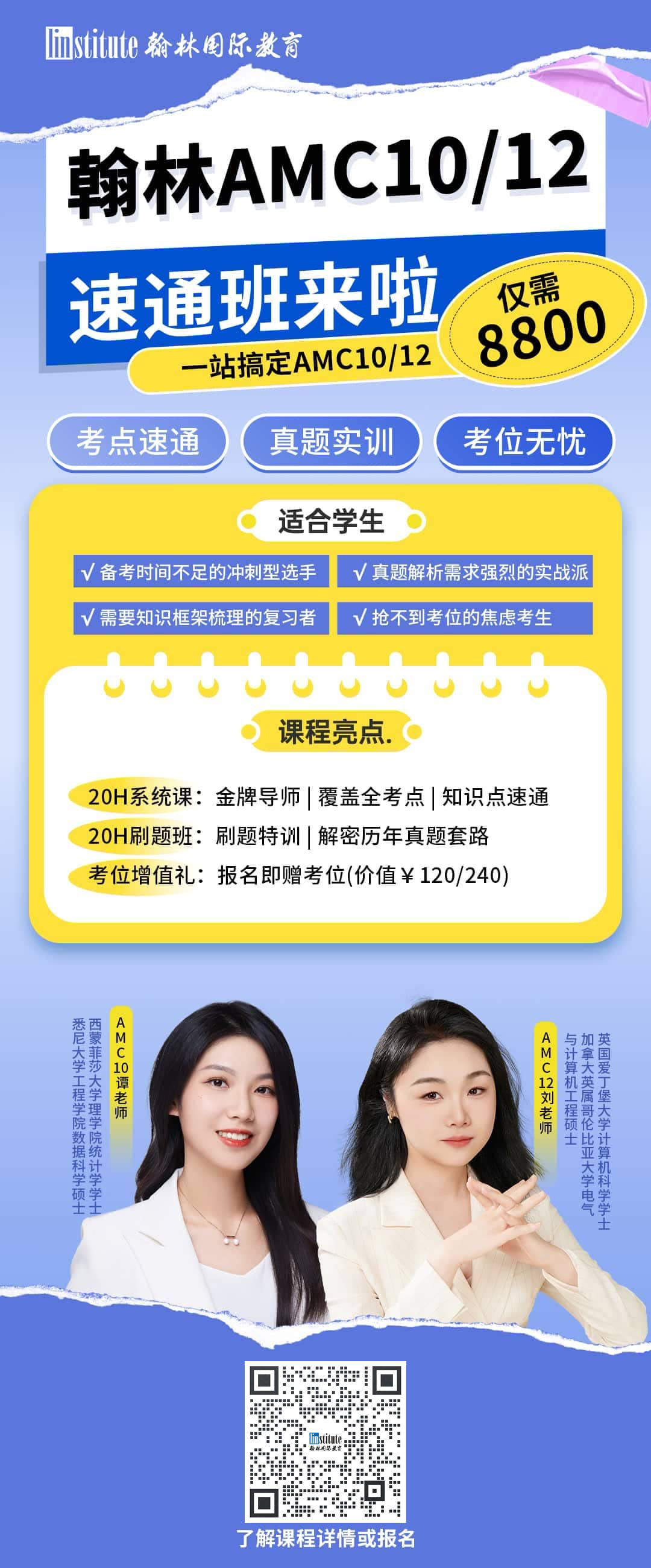 该竞赛旨在激发学生对数学的兴趣,培养学生的解题能力和数学思维。学生若在AMC10/12上取得的优异成绩,不仅能提升海外知名大学申请的竞争力,而且AMC10/12还是进入AIME、USA(J)MO乃至IMO的必经之路。