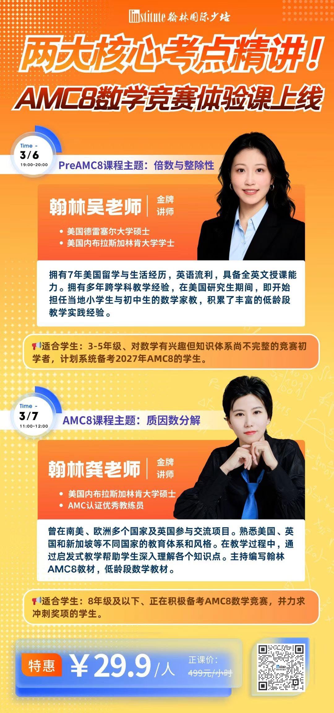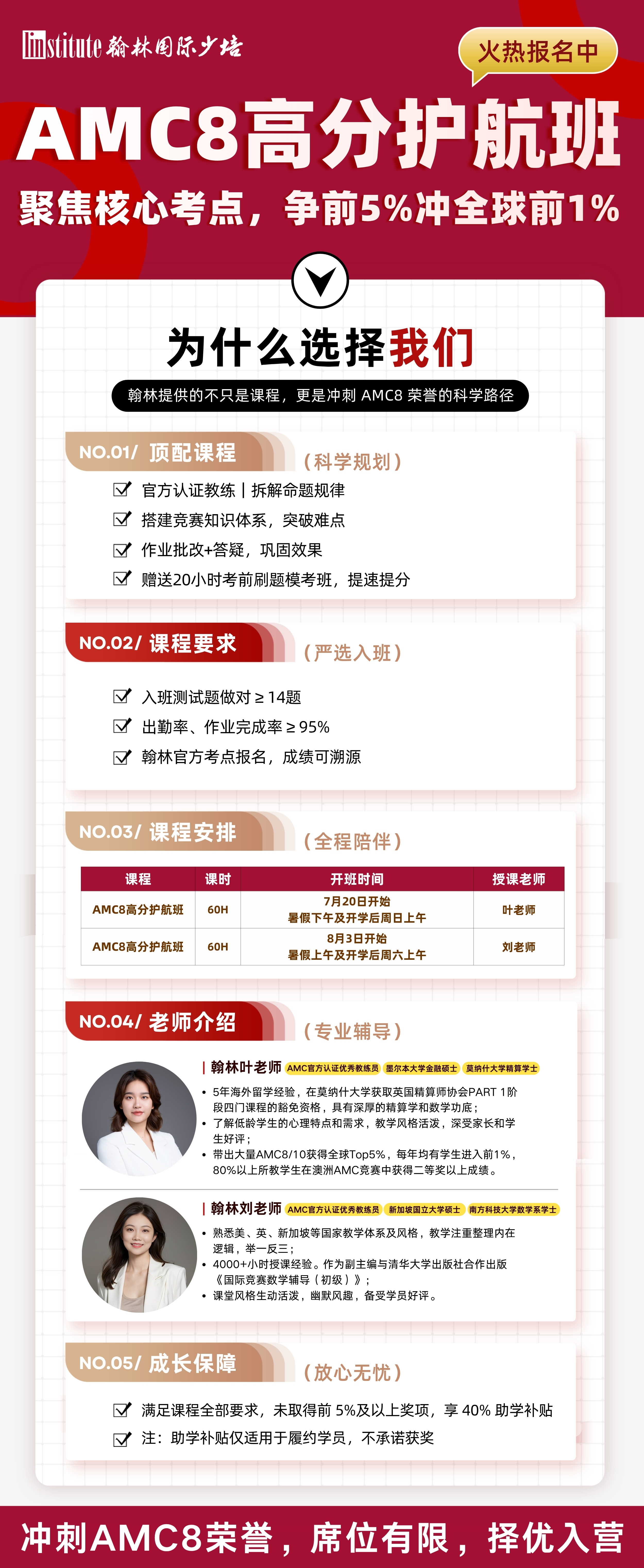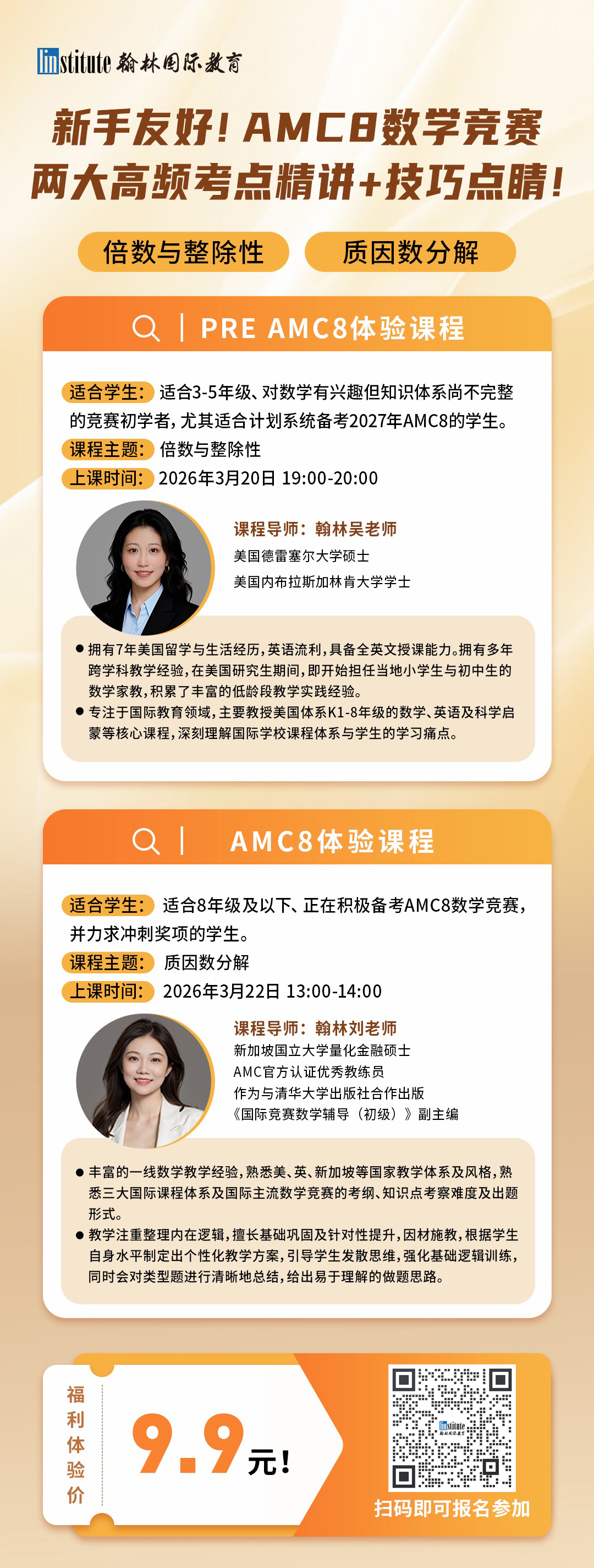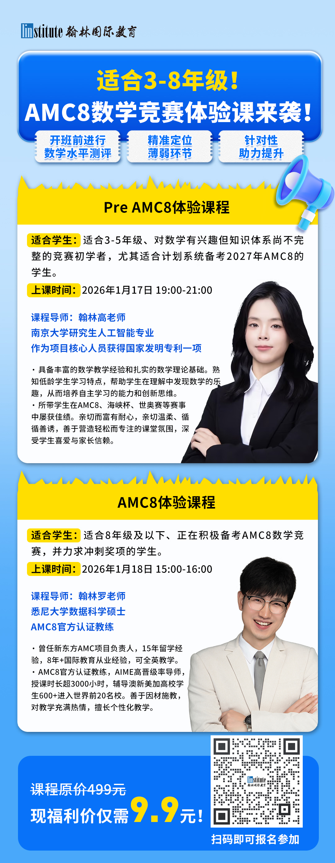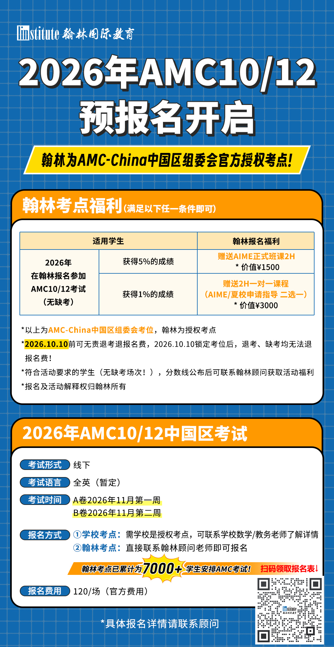 翰林考点开启2027AMC8线上/线下同步报名,更有报名超多报名福利,欢迎抢占名额!