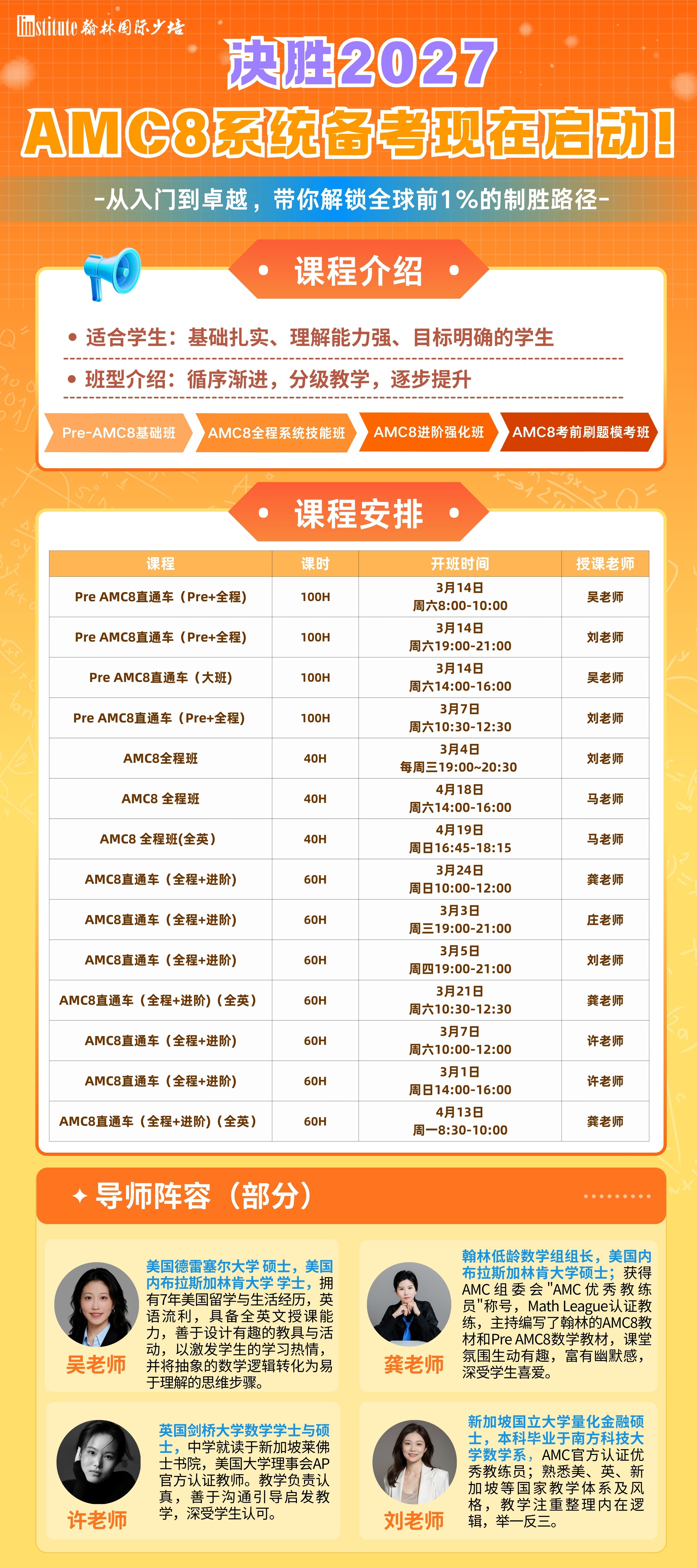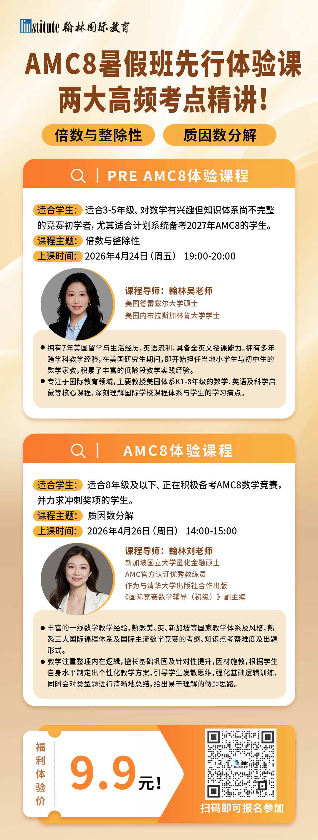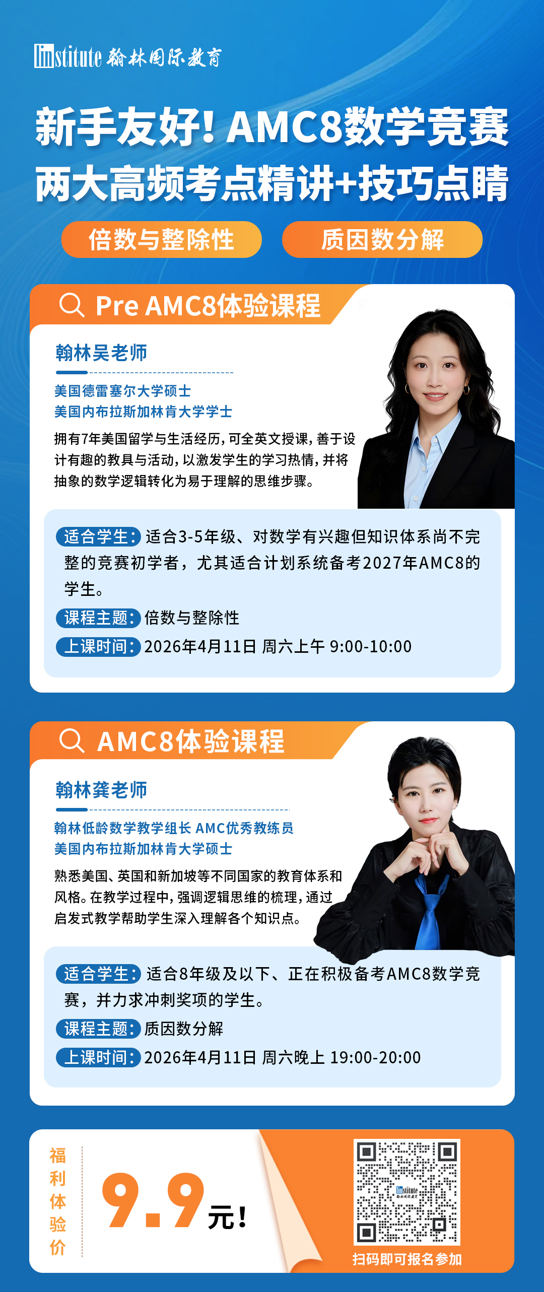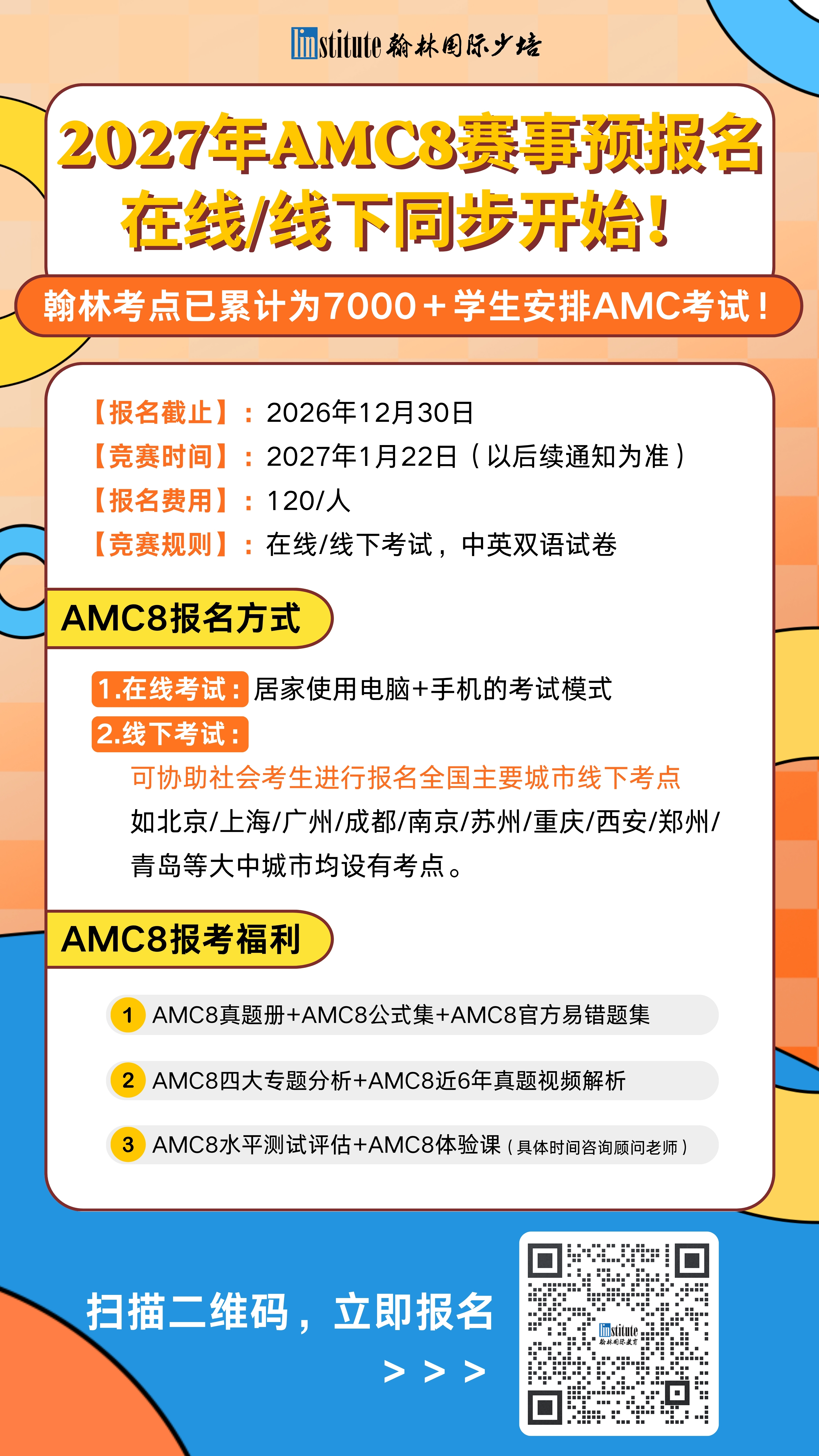 2027年AMC8考试时间已经出炉,即日起翰林考点提供2027年AMC8线上线下考位同步报名,欢迎广大家长咨询了解。