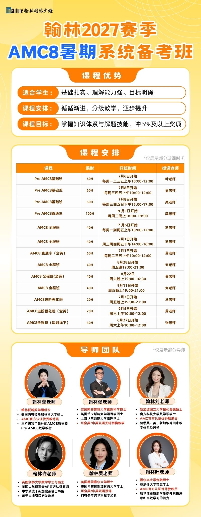 翰林严选海内外TOP院校毕业的优质教师,AMC认证优秀教练员为学生提供高质量的教学服务!助力学生暑期弯道超车,冲击AMC8前1%!