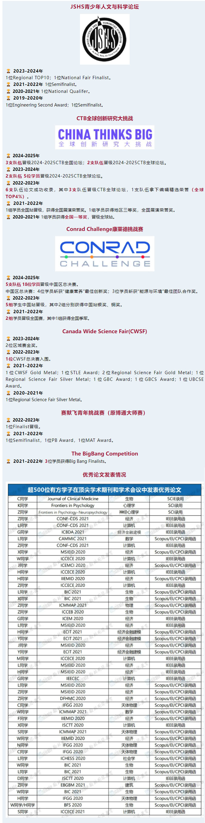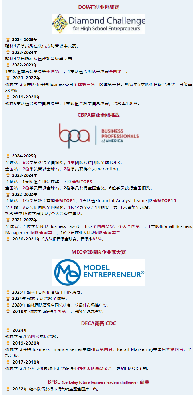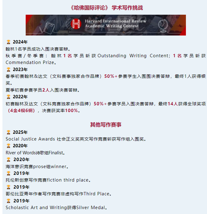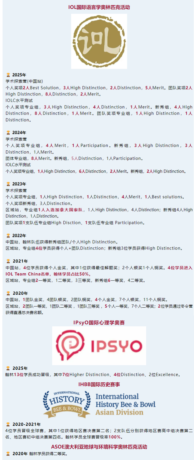 翰林学员一直以来在各类学术活动、文化活动和社会公益等方面取得了众多荣誉。在过去的几年中,翰林学员在全国英语学术活动、数学学术活动、科技创新大赛等领域中屡获佳绩,在全球各地的模拟联合国、演讲比赛等国际活动中也表现出色。同时,翰林学员积极参与各种公益活动,为社会做出了积极贡献。这些荣誉记录展示了翰林学员不断追求卓越、勇攀高峰的精神,也体现了翰林教育在培养学生综合素质和社会责任感方面的成功实践。