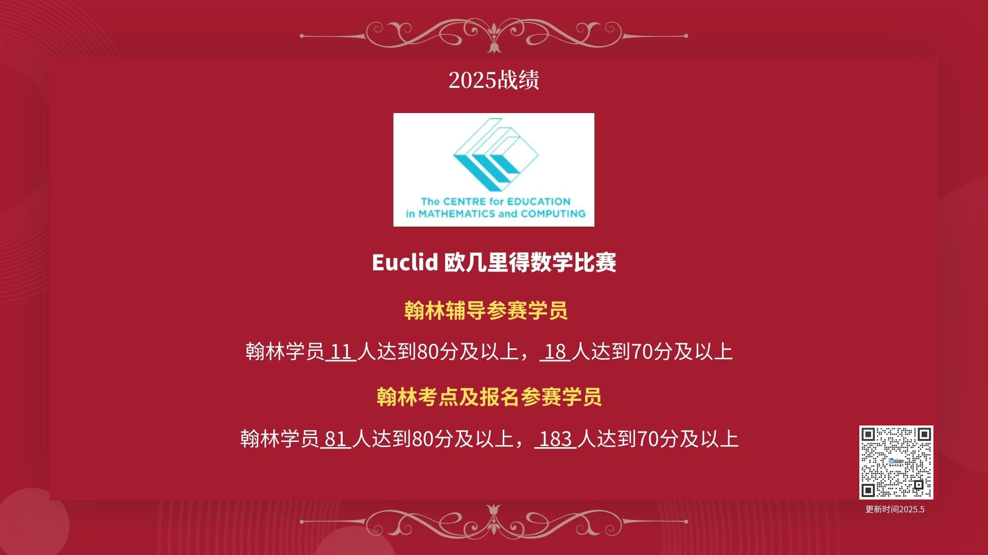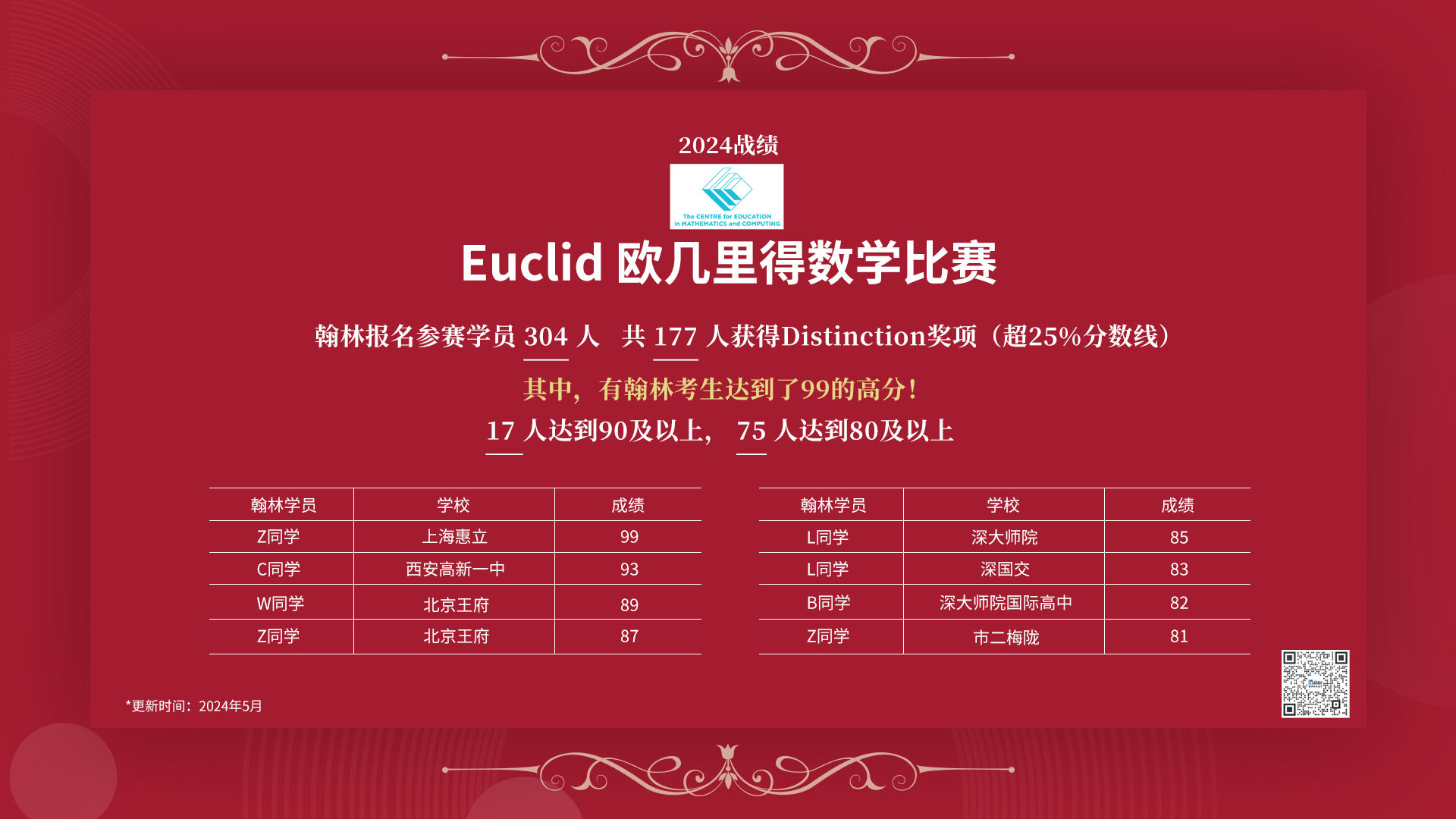 🔹 Honour Rolls:分加拿大地区正式,加拿大地区非正式以及国际区域的高分参赛选手会被分别在各区域荣誉榜提名