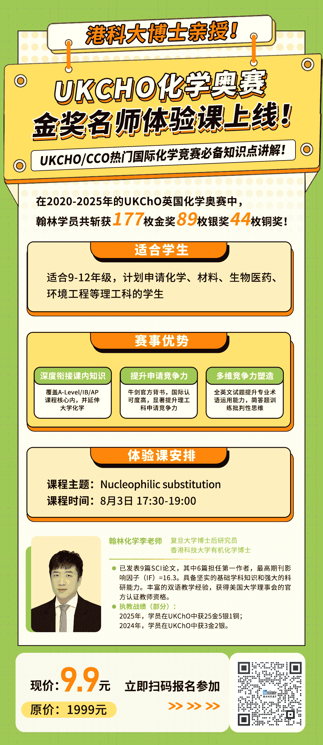 UKCho的目标是英国化学国家队选拔,难度较大。竞赛试题具有一定广度和深度,题型设计紧密结合现实生活、科研和热点,大多以顶级化学期刊上的原创论文为背景。学生需要具备较好的AP、A-level化学基础,而且还要准备好课程以外的拓展延伸。